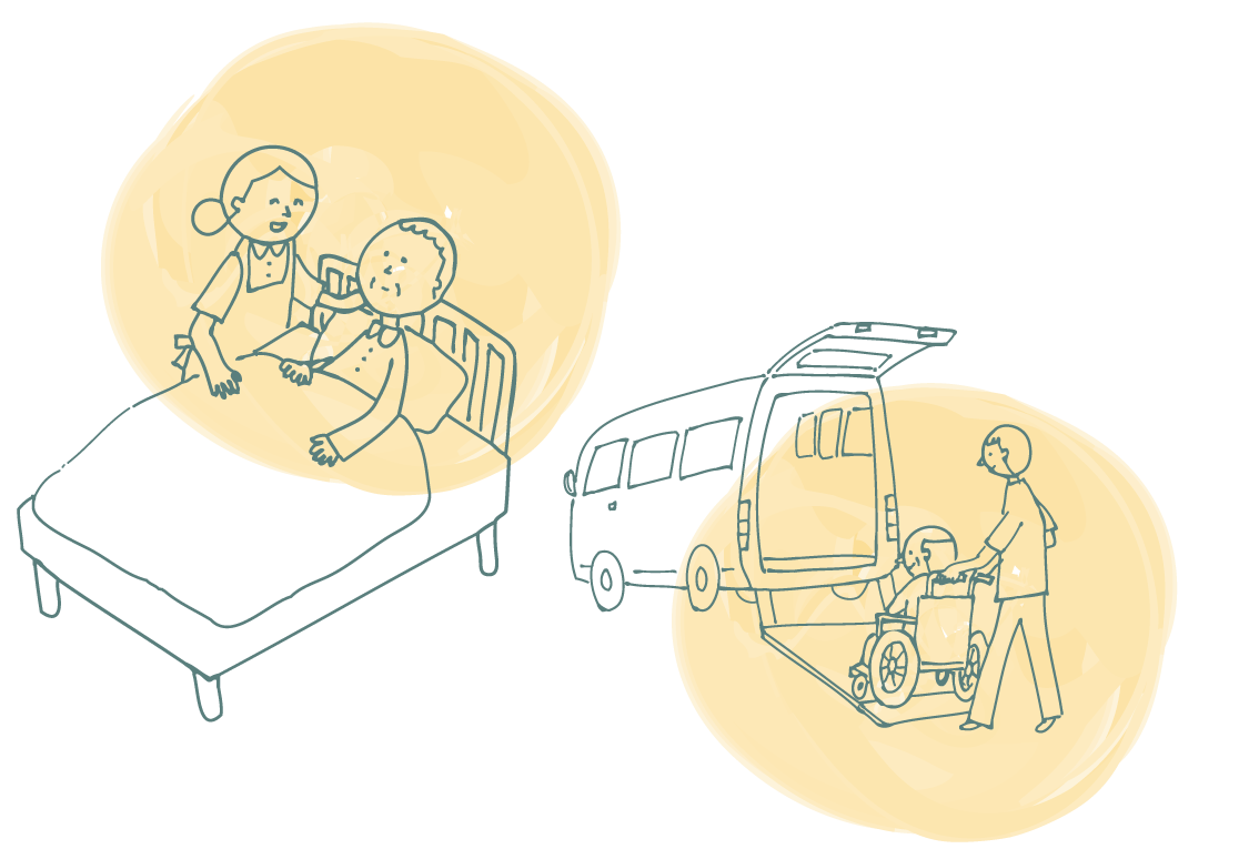 食事、トイレ、お風呂、薬の確認等、生活のお手伝いや見守りをします。